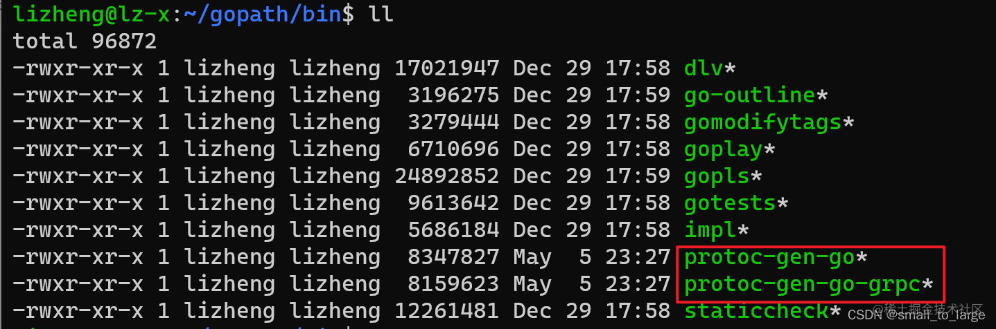 lizheng@lz-x:~$ go install google.golang.org/protobuf/cmd/protoc-gen-go@v1.28 lizheng@lz-x:~$ go install google.golang.org/grpc/cmd/protoc-gen-go-grpc@v1.2