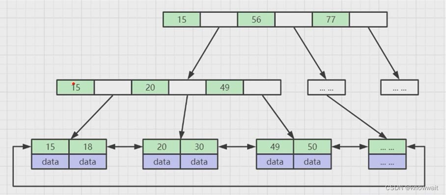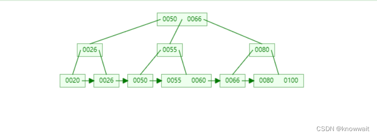 这个结构相对于上述两种结构都有点复杂了,用更详细一点的图来表达可以这么看,他实际上还是树,但是一个树节点上不只有一个索引数据,只有最底层的叶子节点上才有数据(这个数据就是我们mysql表中的一列数据或者是mysql数据对应的磁盘地址),而其他节点只存储索引,也叫作冗余索引。
