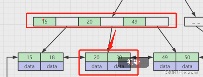 然后相应的再往下找到30所在的区间位置,遍历最后一个叶子节点就可以获取到30那条数据