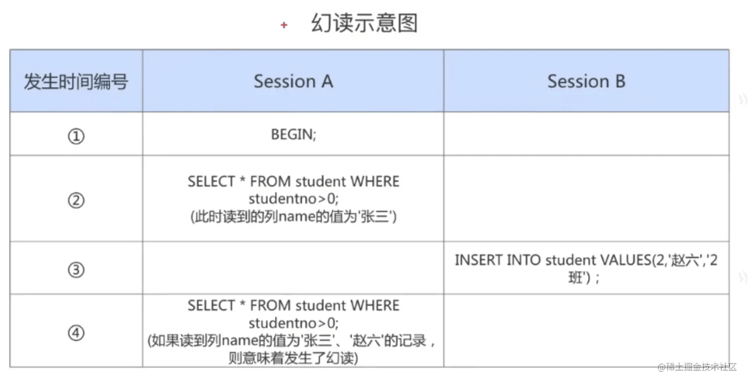 事务A一开始只读取到‘张三’的数据记录。然后另外一个事务B插入了‘赵六’的数据记录。事务A再次读取,发现了‘张三’、‘赵六’两条数据,明明同一个事务,同样的查询条件,前后两次读取,多了一条记录,相当于“幻影”,这种情况就是幻读。