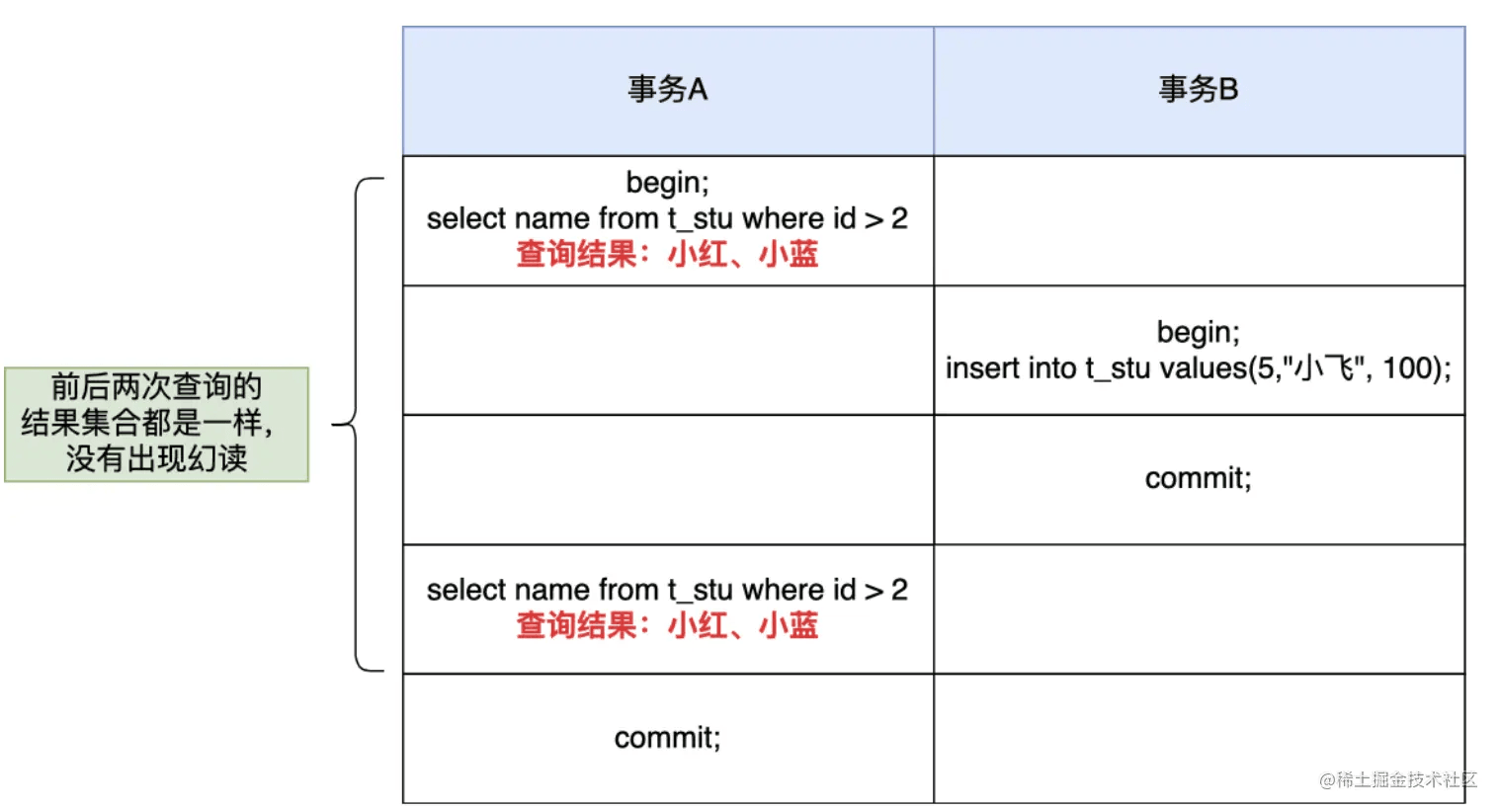 - 事务A在启动的时候创建了一个“快照”,查询出结果“小红,小蓝”