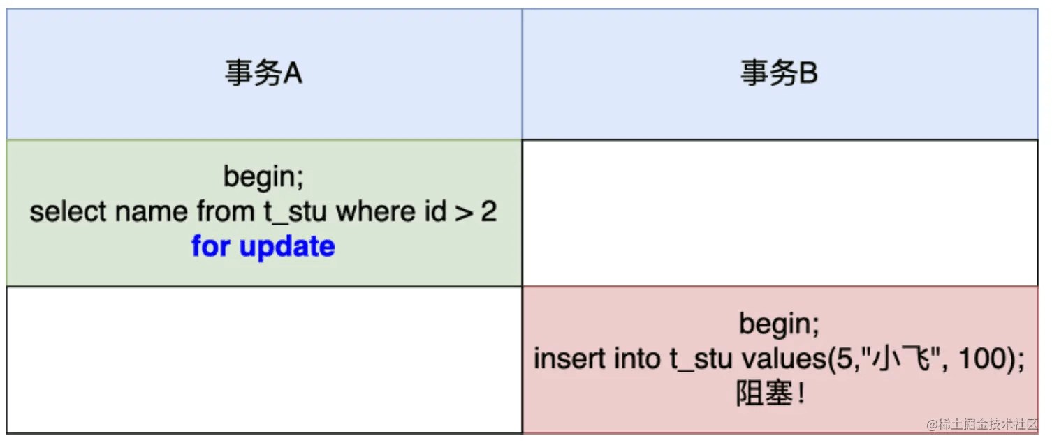for_update是属于当前读,它会对锁定 id 范围(2, +∞],相当于理解是间隙锁。 - 事务B插入了