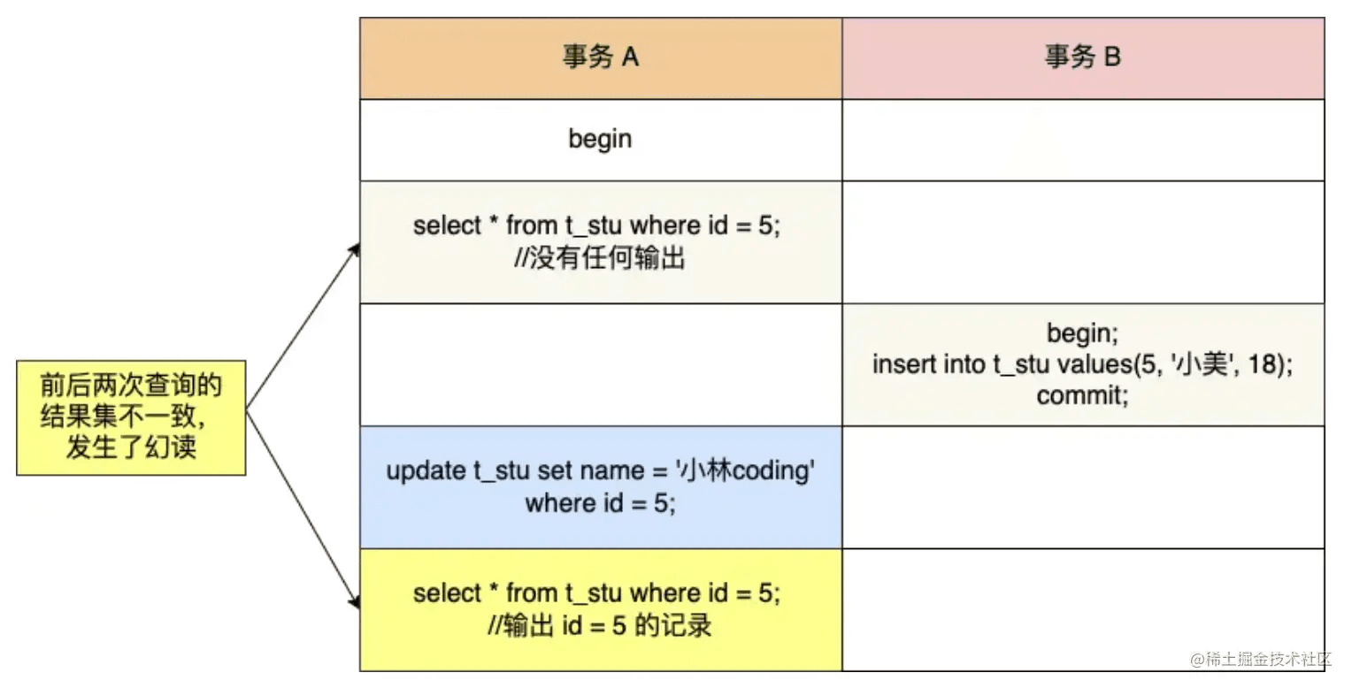 但是,强调一点的是,MySQL在可重复读级别下,并没有完完全全的解决幻读问题,特别是在一个事务的快照读和当前读穿插使用的场景下,还是会出现幻读的情况,比如下图所示。