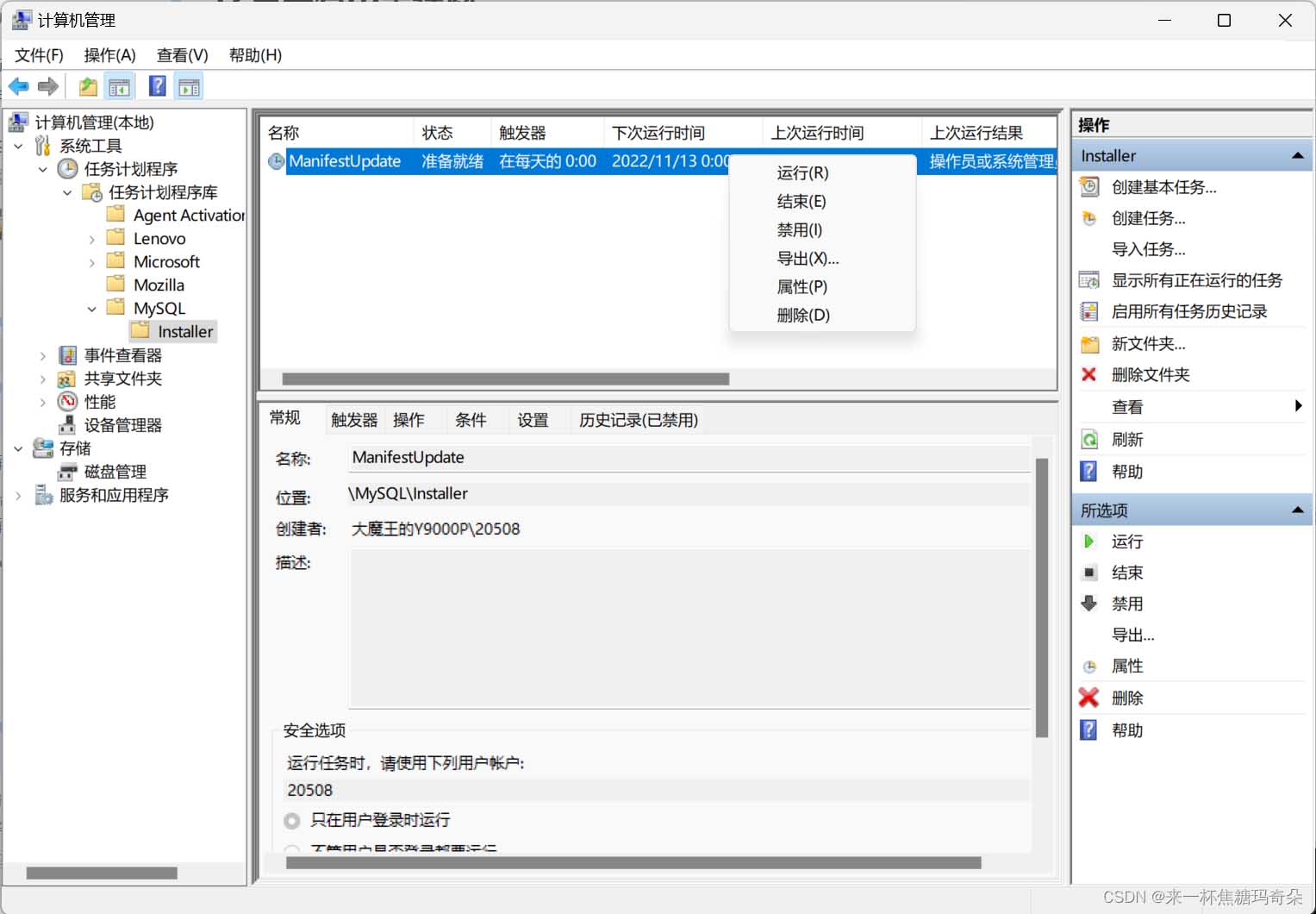 3、选择“MySql”,点击Installer,可见任务每天晚上12点自动触发,右键将任务删除。