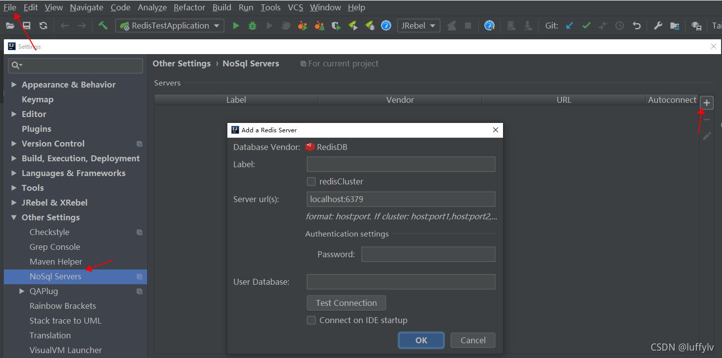 安装完后,通过右侧工具栏或File->Setting->Other Settings->NoSql Server可找到连接Redis的窗口,如下图: