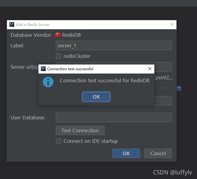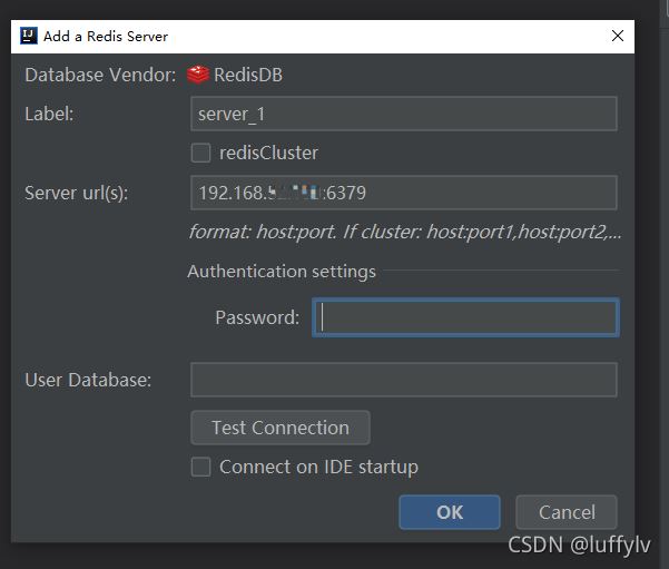 在此处填写虚拟机ipv4地址,端口号使用的是redis默认的6379,此端口号以redis.config配置文件中配置的redis服务端口为准。由于我连接的不是redis集群,且没有设置redis密码,只填Label和Server url(s)两处即可。如下图所示。