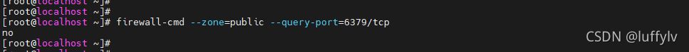 [root@localhost ~]# firewall-cmd --zone=public --add-port=6379/tcp --permanent [root@localhost ~]# firewall-cmd --reload [root@localhost ~]# firewall-cmd --zone=public --query-port=6379/tcp