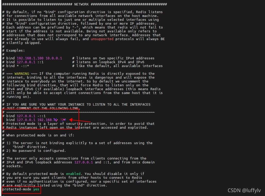方式二、放开bind并绑定redis服务器所在虚拟机的两个网卡ip地址(其中127.0.0.1是回环地址,用于redis服务器所在虚拟机访问redis服务,另一个网卡地址用于远程访问)