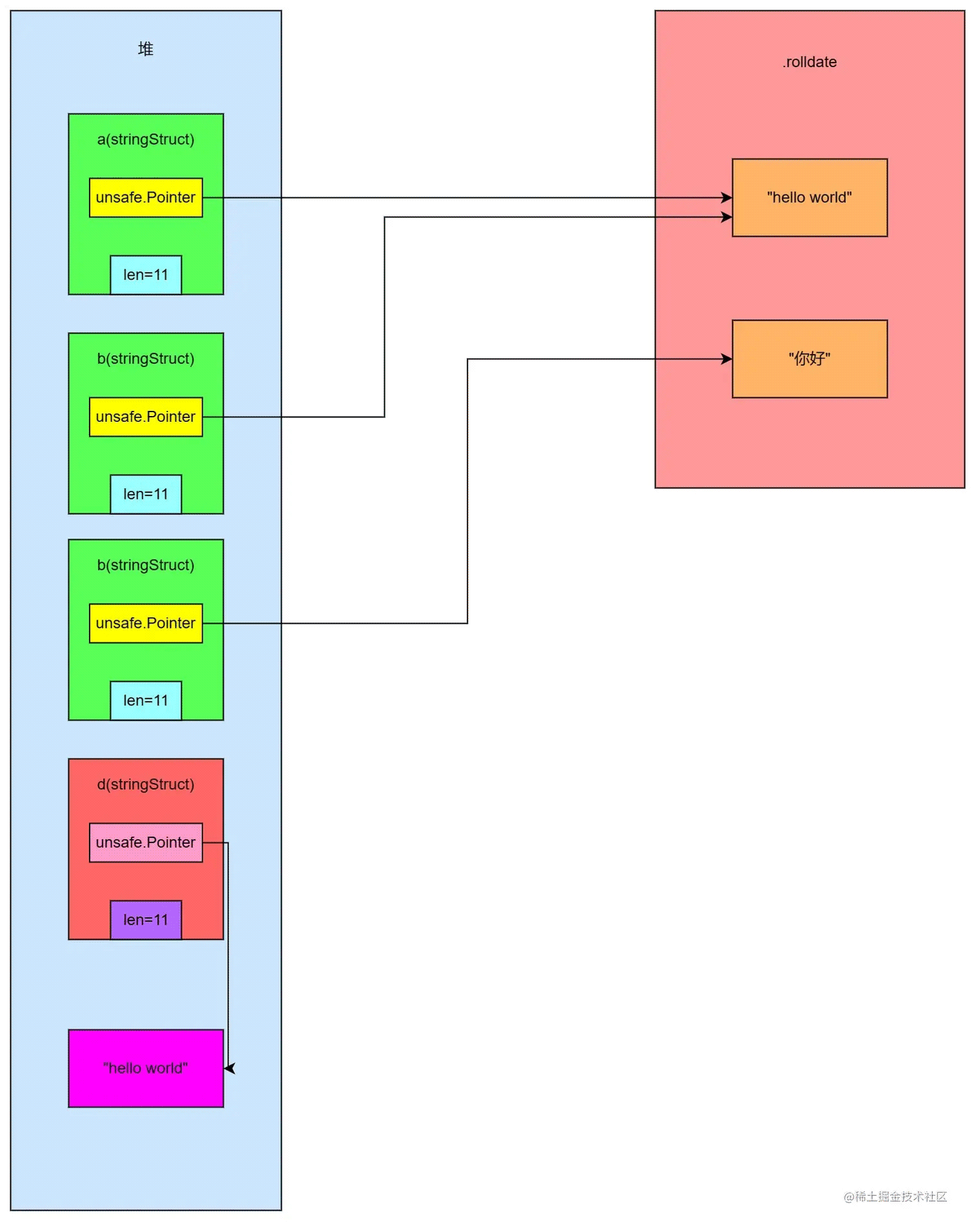 //此时字符串str的unsafe.Pointer指针str会重新指向堆中内存
