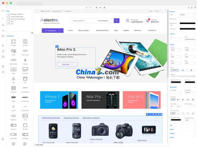 VvvebJs是一个开源的网页拖拽自动生成的JavaScript库,你可以以简单拖拽的方式生成自己需要的网页样式,内置jquery和Bootstrap,你可以拖拽相关的组件进行网页的构建,非常的方便,而且可以实时修改代码,功能丰富,使用简单,界面友好,特别适合一些专注于展示的网页设计。相关特性:组件和块/片段拖放。撤消/重做操作。一两个面板界面。文件管理器和组件层次结构导航。添加新页面。实时代码编