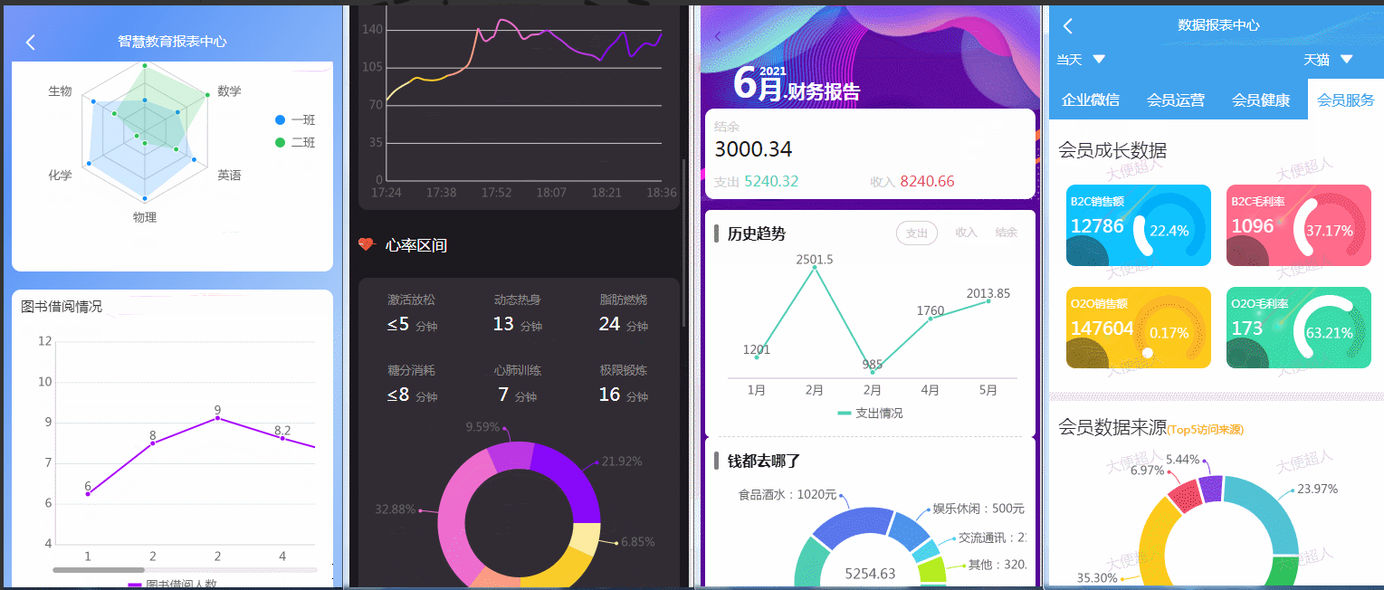 ReportPlust意在打造一套精美的数据报表模板,里面高度封装日历组件、表格组件、排行榜组件、条形进度条组件、文本块组件以及ucharts的多个图表组件,用户只需要按照虚拟数据的格式,传特定数据即可方便、快捷地打造出属于自己的报表页面。