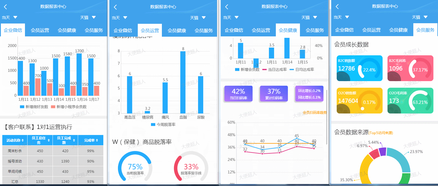 ReportPlust意在打造一套精美的数据报表模板,里面高度封装日历组件、表格组件、排行榜组件、条形进度条组件、文本块组件以及ucharts的多个图表组件,用户只需要按照虚拟数据的格式,传特定数据即可方便、快捷地打造出属于自己的报表页面。该小程序主要使用了ucharts和wyb-table两插件实现的数据报表功能。特点使用的是uni-app中最受欢迎的图表uCharts插件完成图表展示,该插件文