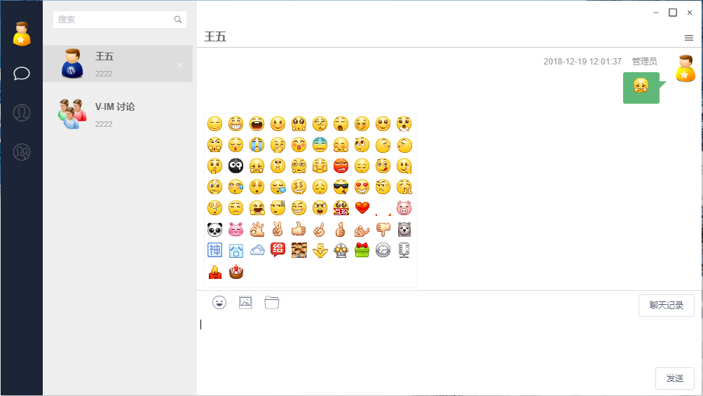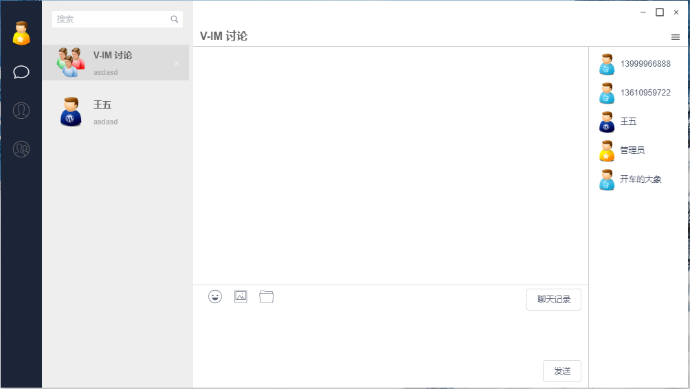 V-IM是一款基于JS的超轻量级聊天软件。前端:vue、iview、electron实现的PC桌面版聊天程序,主要适用于私有云项目内部聊天,企业内部管理通讯等功能,主要通讯协议websocket。支持web网页聊天实现。服务端: springboot、tio、oauth2.0等技术。