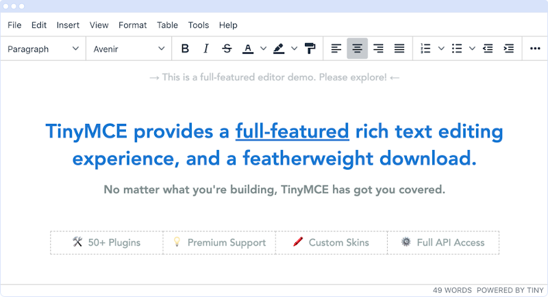 TinyMCE提供了一系列配置选项,使您可以将其集成到应用程序中。从基本设置开始自定义。