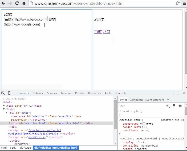 mdeditor是一款原创markdown编辑器,基于textarea,同步预览html,不依赖任何插件,支持自定义语法,压缩版7k,使用简单。