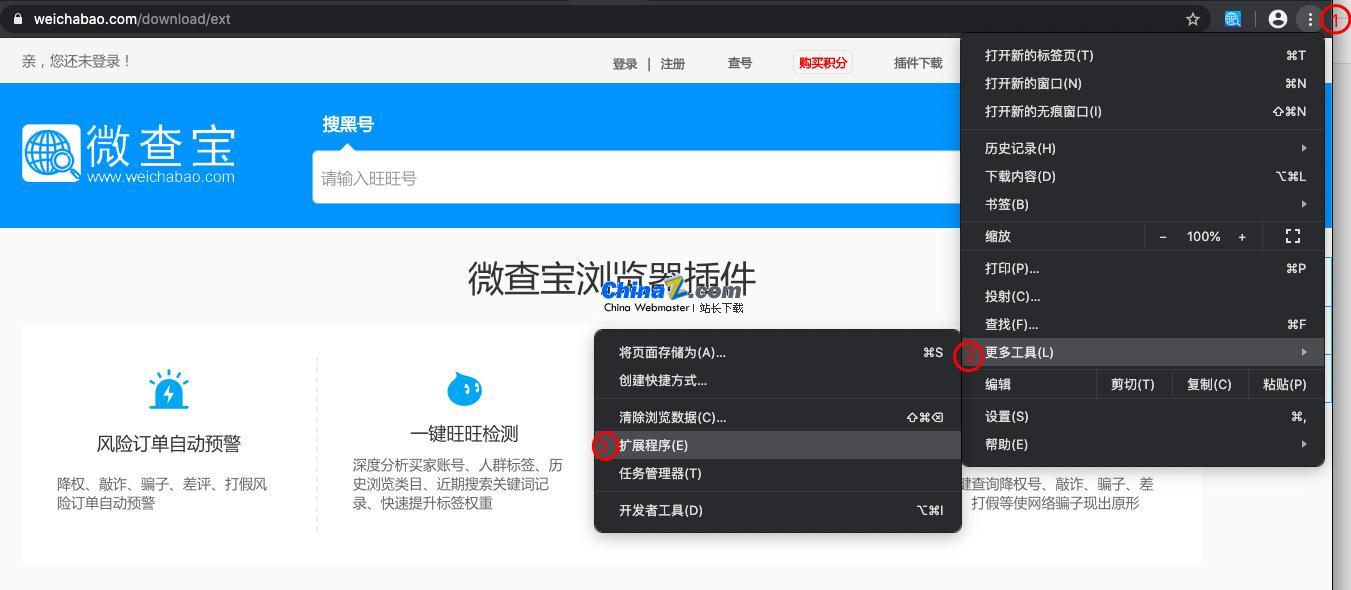 首先,你需要安装微查宝的插件,点击浏览器上方状态栏,点击“扩展”。