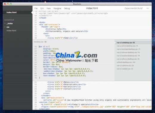 Brackets 是 Adobe 的开源 HTML/CSS/JavaScript 集成开发环境。Brackets 当前为Mac, Windows以及Linux (Debian/Ubuntu)提供最新稳定版的二进制发布, 源代码托管在GitHub上。