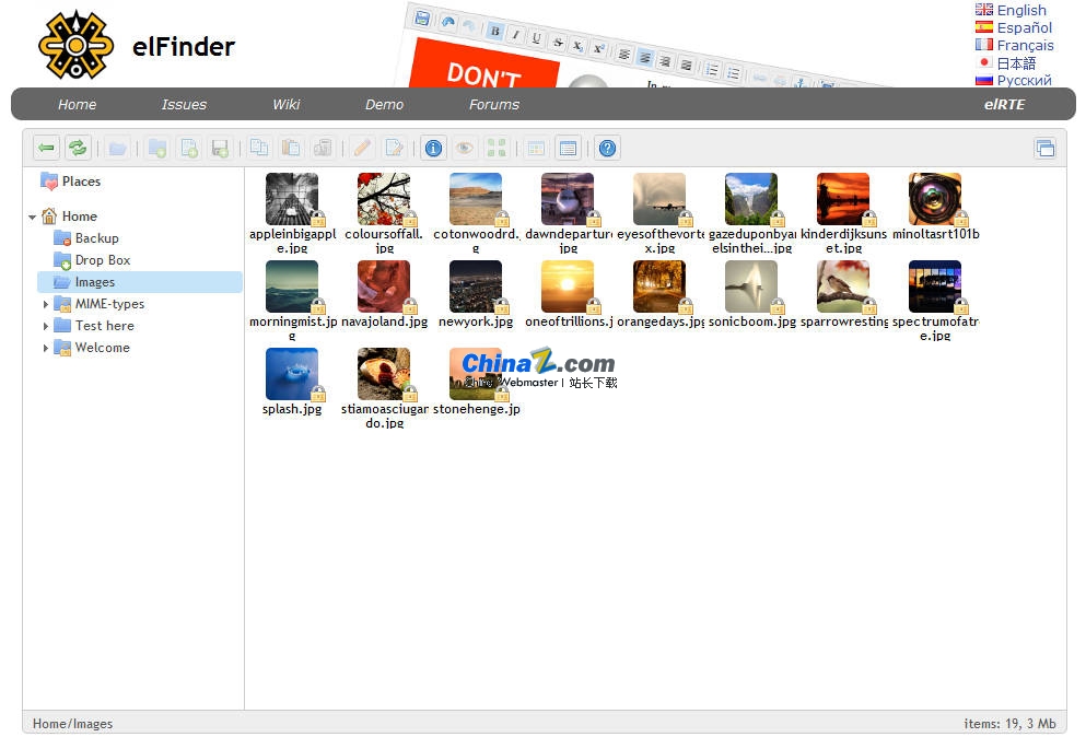 elFinder是基于Web的开源文件管理器,用JavaScript编写,使用了jQueryUI,灵感来自MacOSX的Finder程序。elFinder的主要目标是让你管理远程文件,像管理本地文件一样方便。它支持常用的本地操作方式,比如拖曳、移动、热键等。elFinder还可以创建和解压文档,QuickLook功能可以快速查找并浏览图片、Flash、文本、视频甚至PDF,允许你创