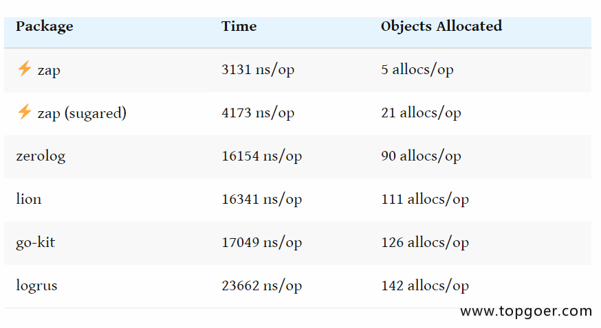根据Uber-go Zap的文档,它的性能比类似的结构化日志包更好——也比标准库更快。 以下是Zap发布的基准测试信息