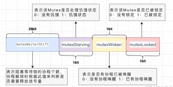 state表示锁的状态,有锁定、被唤醒、饥饿模式等,并且是用state的二进制位来标识的,不同模式下会有不同的处理方式