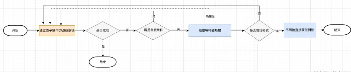 通过原子操作cas加锁,如果加锁不成功,根据不同的场景选择自旋重试加锁或者阻塞等待被唤醒后加锁