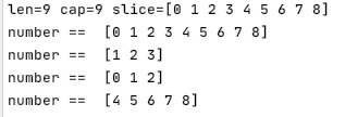fmt.Printf("len=%d cap=%d slice=%v\n",len(number),cap(number),number)
