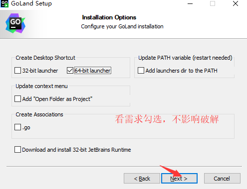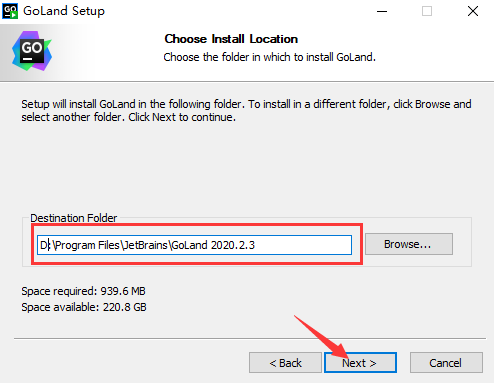 2.双击运行GoLand2020.2.3安装包,设置安装位置,建议将其安装到固态硬盘(如果有),然后单击下一步