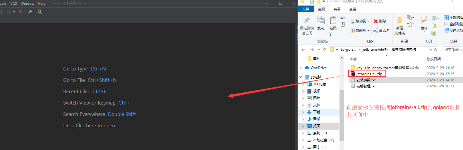 10.从下载的GoLand2020 破解包中,解压后(Mac不用自带解压工具,推荐The unarchiver),找到jetbrains-all.zip,用鼠标左键拖拽到GoLand主界面(注意jetrains-all.zip不需要解压!)