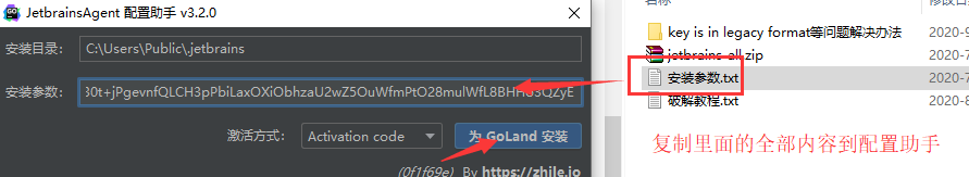 12.GoLand重启后会弹出配置助手。此时,用记事本打开安装参数.txt。把里面的所有内容复制到 配置助手的安装参数里,点击 为goland安装。