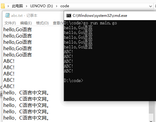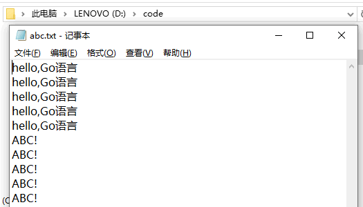 package mainimport ( "fmt" "os" "bufio")func main() { //创建一个新文件,写入内容 5句 hello,Go语言 filePath := "d:/code/abc.txt" file, err := os.OpenFile(filePath, os.O_WRONLY | os.O_CREATE, 0666) if err != nil{ fmt.Println("open file err",err) } //及时关闭file句柄 defer file.Close() //写入文件时,使用带缓存的 *Writer write := bufio.NewWriter(file) for i := 0; i 执行之后,可以看出文件已被写入: