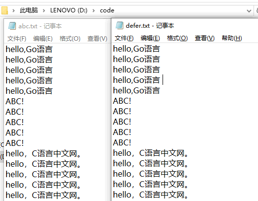 package mainimport ( "fmt" "io/ioutil")func main() { file1Path := "d:/code/abc.txt" file2Path := "d:/code/defer.txt" data, err := ioutil.ReadFile(file1Path) if err != nil{ fmt.Printf("open file err=%v",err) return } err = ioutil.WriteFile(file2Path, data,0666) if err != nil{ fmt.Printf("open file err=%v",err) }}执行,发现内容复制成功: