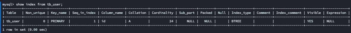 通过show index from tb_user; 命令查看表,没有存在任何的索引。