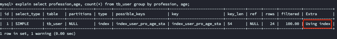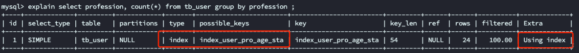 发现使用了索引“index_user_pro_age_sta”。说明在执行 group by操作的时候,使用联合索引是有效的。