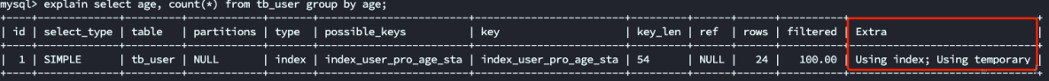 SQL 语句使用age 进行group by,查看explain的结果如下: