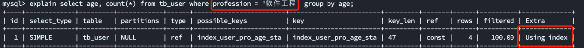 explain select age, count(*) from tb_user where profession = '软件工程' group by age;