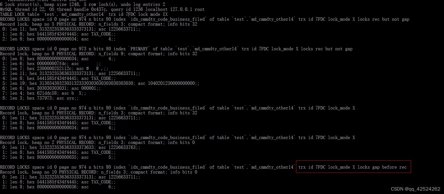 2021-03-15 16:40:49 0x7f17e97ff700 *** (1) TRANSACTION: TRANSACTION 2120576727, ACTIVE 0 sec inserting mysql tables in use 1, locked 1 LOCK WAIT 5 lock struct(s), heap size 1136, 4 row lock(s), undo log entries 2 MySQL thread id 9384894, OS thread handle 139741055362816, query id 309547615 10.96.197.241 nsfbususr update INSERT INTO MD_CMMDTY_OTHER19( cmmdty_code, business_field, business_field_desc, keyword_code, lastmodifier, lastmodified ) VALUES ( '12256633711', 'TAX_CODE', '1040201230000000000', '000001', 'sys', now() ) ON DUPLICATE KEY UPDATE business_field = 'TAX_CODE', business_field_desc = '1040201230000000000', keyword_code = '000001', lastmodifier = 'sys', lastmodified = now() *** (1) WAITING FOR THIS LOCK TO BE GRANTED: RECORD LOCKS space id 306 page no 1310102 n bits 496 index idx_cmmdty_code_business_field of table `nsfbusprd`.`md_cmmdty_other19` trx id 2120576727 lock_mode X waiting *** (2) TRANSACTION: TRANSACTION 2120576728, ACTIVE 0 sec inserting, thread declared inside InnoDB 5000 mysql tables in use 1, locked 1 4 lock struct(s), heap size 1136, 3 row lock(s), undo log entries 2 MySQL thread id 9481029, OS thread handle 139740678452992, query id 309547616 10.98.61.213 nsfbususr update INSERT INTO MD_CMMDTY_OTHER19( cmmdty_code, business_field, business_field_desc, keyword_code, lastmodifier, lastmodified ) VALUES ( '12256633763', 'TAX_CODE', '1040201230000000000', '000001', 'sys', now() ) ON DUPLICATE KEY UPDATE business_field = 'TAX_CODE', business_field_desc = '1040201230000000000', keyword_code = '000001', lastmodifier = 'sys', lastmodified = now() *** (2) HOLDS THE LOCK(S): RECORD LOCKS space id 306 page no 1310102 n bits 496 index idx_cmmdty_code_business_field of table `nsfbusprd`.`md_cmmdty_other19` trx id 2120576728 lock_mode X locks rec but not gap //持有记录锁 *** (2) WAITING FOR THIS LOCK TO BE GRANTED: RECORD LOCKS space id 306 page no 1310102 n bits 496 index idx_cmmdty_code_business_field of table `nsfbusprd`.`md_cmmdty_other19` trx id 2120576728 lock_mode X waiting //等待X锁 *** WE ROLL BACK TRANSACTION (2)