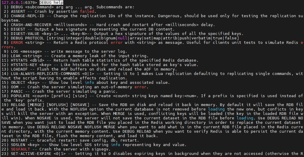 redis提供的debug命令可以自己研究下,里面涉及到模拟redis异常场景如oom、宕机、命令执行失败,redis重载rdb文件、aof文件,模拟redis命令耗时等等,我们可以通过DEBUG help查看详情,如下所示