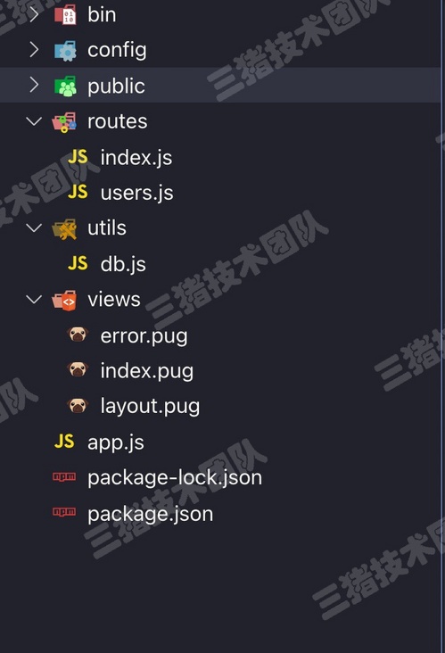 其中 utils 下为工具文件夹。db.js 连接数据的js文件 public为静态文件 config > default.js 为默认的配置文件 routes 为路由文件夹