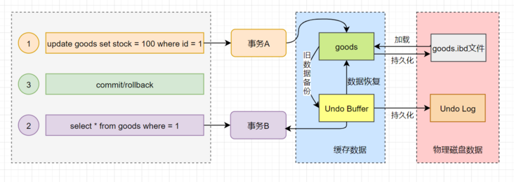 事务A手动开启事务后,对goods数据表中id为1的数据进行更新操作,首先会把更新命中的数据写入到Undo Buffer中。在事务A未提交之前,此时,事务B手动开启事务,对goods数据表中的id为1的数据进行查询操作,此时的事务B会读取Undo Log中的数据并返回给客户端,这就是MySQL中的MVCC机制。