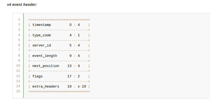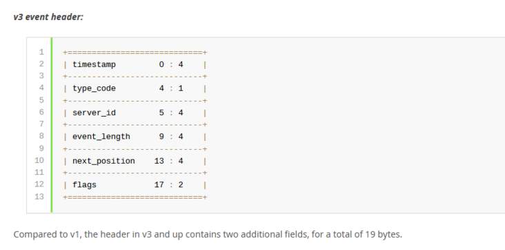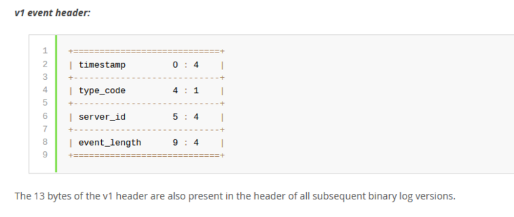 关于Binlog文件结构的具体信息,小伙伴们可以参考MySQL的官方文档,具体链接为:https://dev.mysql.com/doc/internals/en/event-header-fields.html