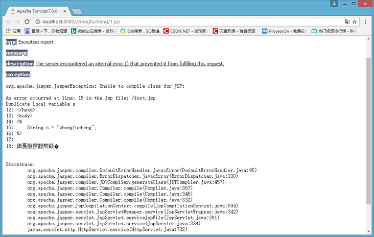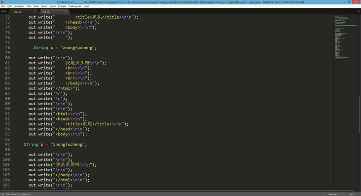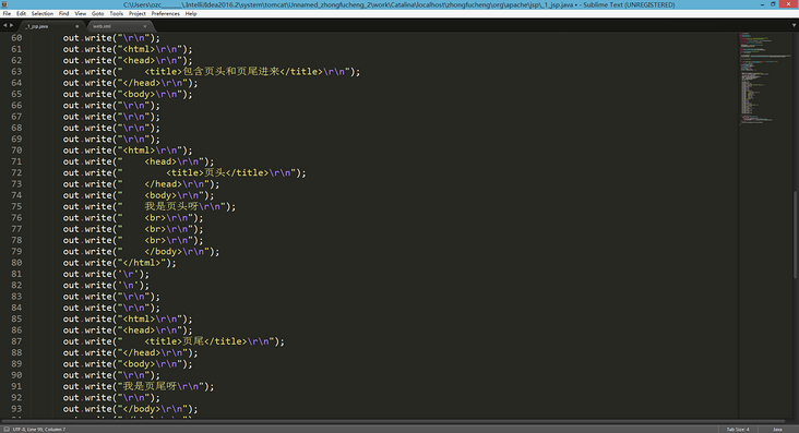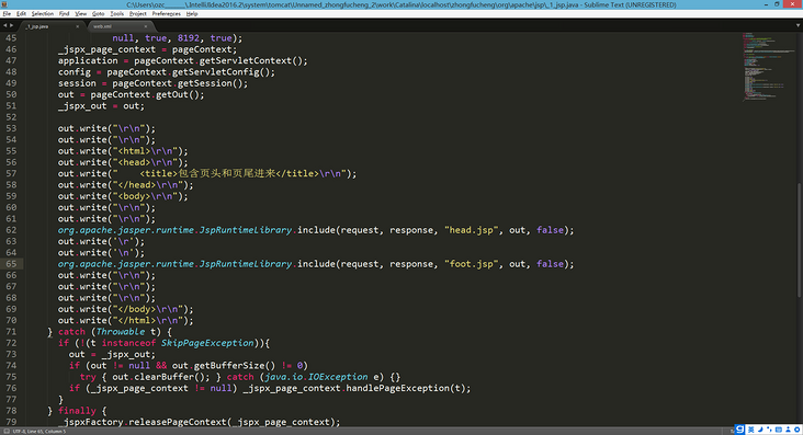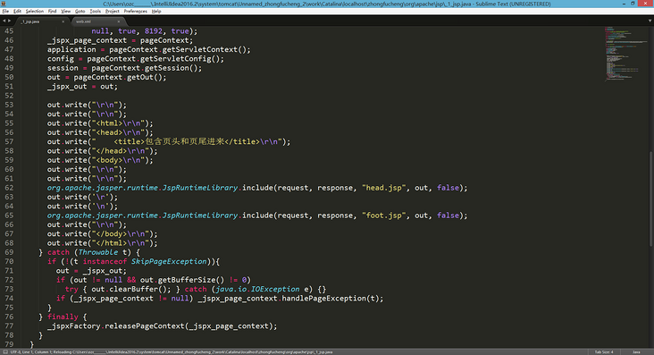 - 编译过程是这样子的:浏览器第一次请求1.jsp时,Tomcat会将1.jsp转化成1_jsp.java这么一个类,并将该文件编译成class文件。编译完毕后再运行class文件来响应浏览器的请求。