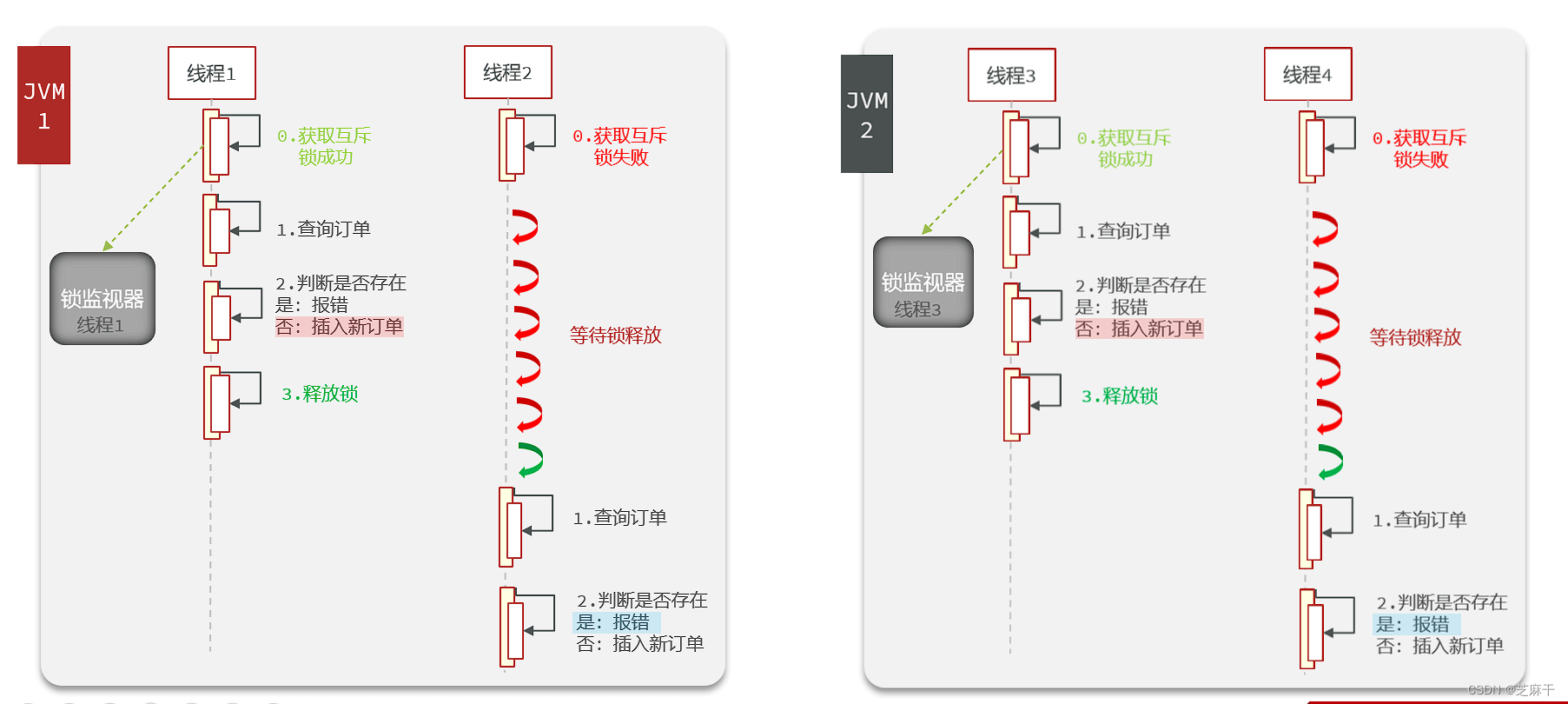 理想的情况下是这样的:一个线程成功获取互斥锁,并对查询订单并创建订单,其他线程无法干预。它的原理是会有一个锁监视器,来监听是谁获得了锁。