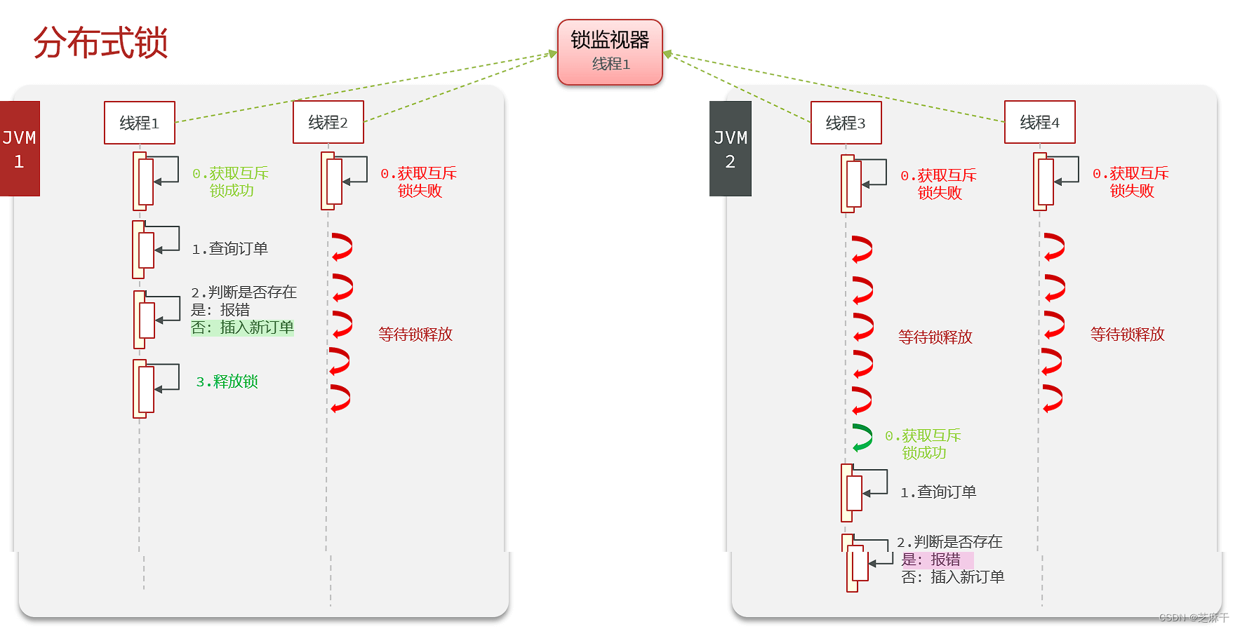 分布式系统下,有多个不同的JVM,不同的JVM的环境下,锁监听器是有多个的,就会出现有的线程在别的线程已经拿到锁的情况下,仍然可以获取的到锁。