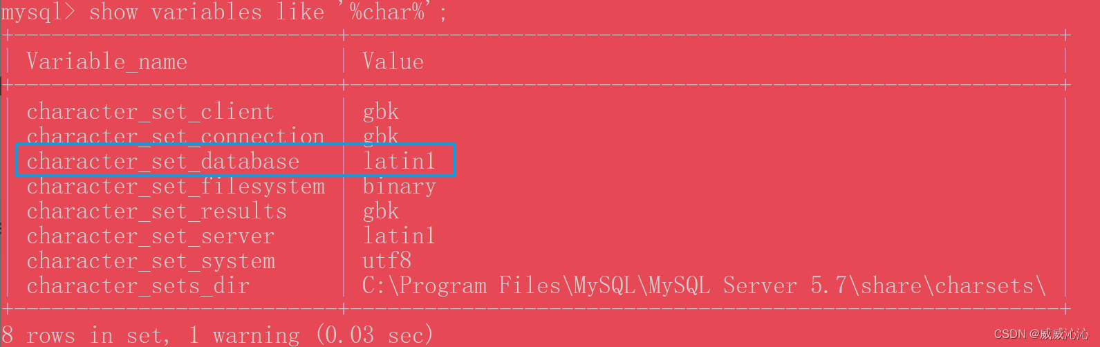 我们看 character_set_database 这一行对应 Value的是 latinl,而 latinl 是拉丁文,是不支持中文的。
