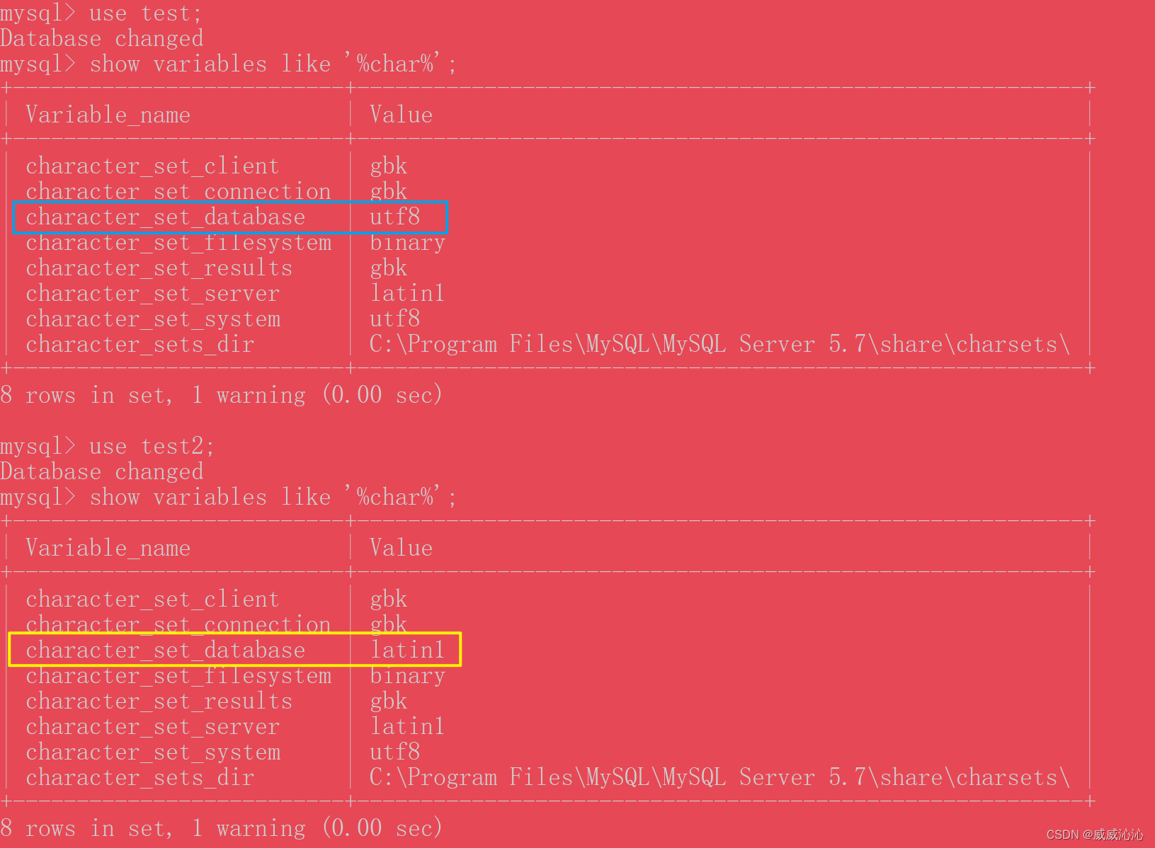 我们再查看该数据库时,我们会发现我们设置数据库字符集改变了,但是当我们使用其他数据库时,其字符集还是 latinl。