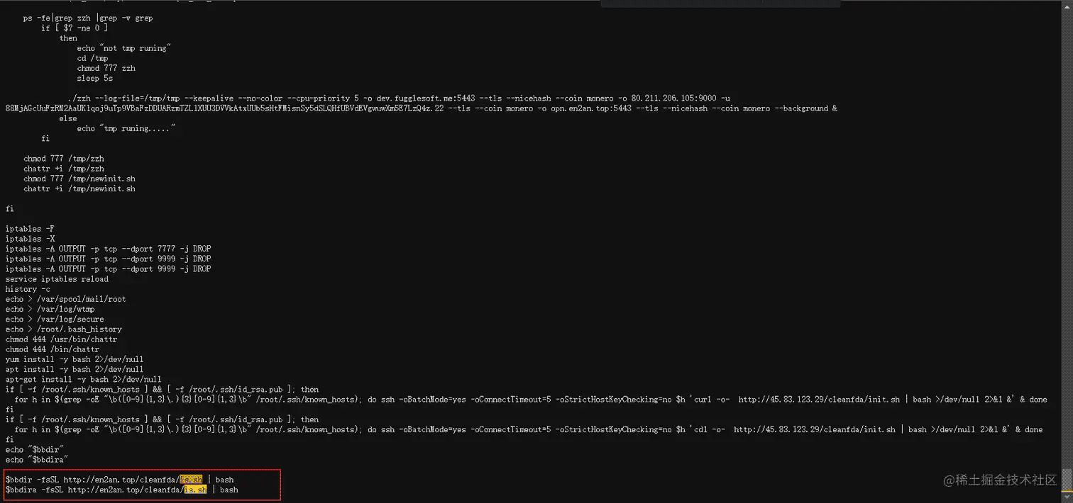 这个脚本还挺多的,关闭selinux、杀掉别人的挖矿进程、杀掉CPU占用过高的进程,如果是自己就跳过、修改破坏系统命令、自己造一个下载器downloads()函数、解锁和加锁定时任务、添加挖矿技术任务、设置SSH免密登陆、下载执行矿机挖矿程序、关闭防火墙、清除日志、感染已知的免密机器、下载执行is.sh。