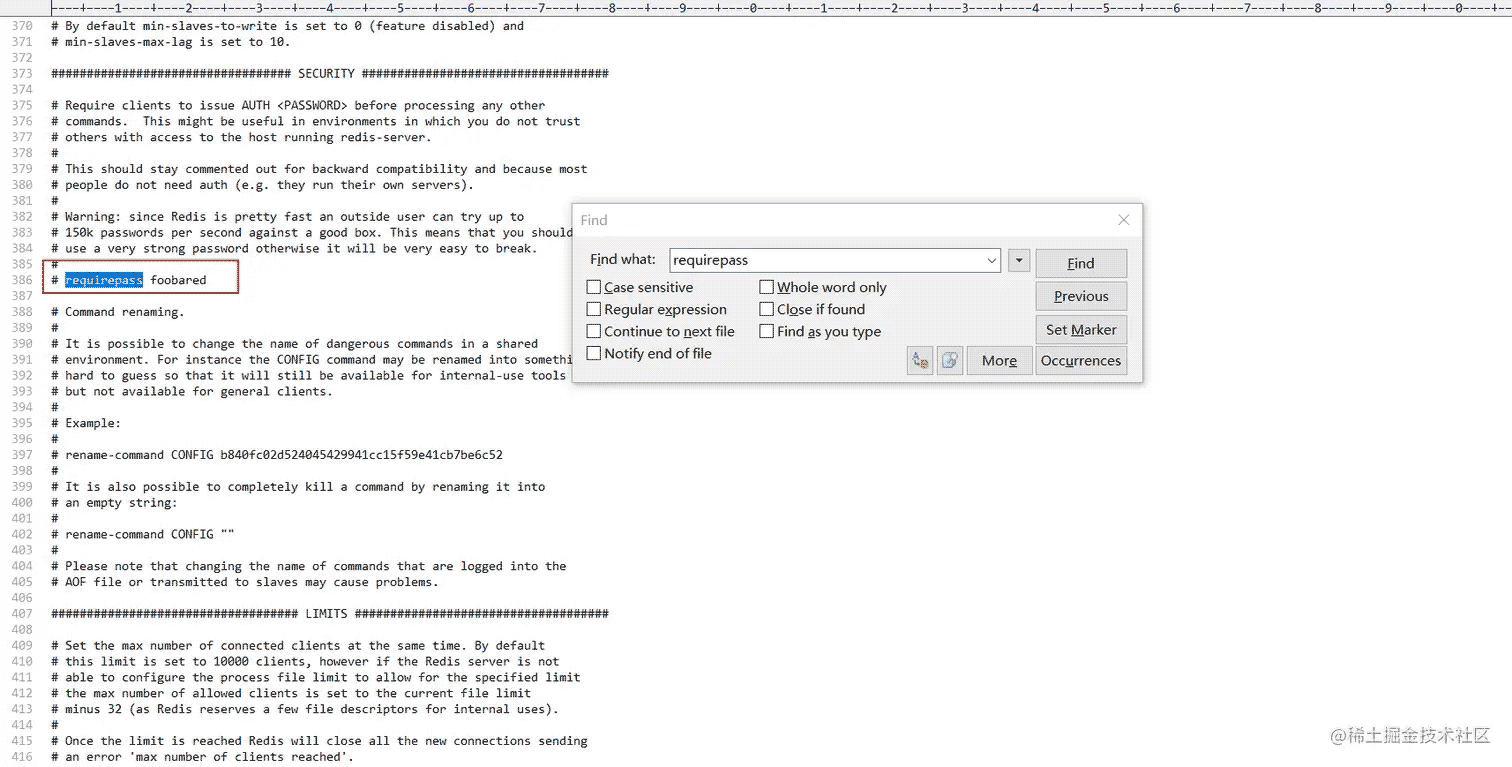 我们编辑此文件,找到requirepass,放开注释,设置指定的值就,重启redis就生效了。